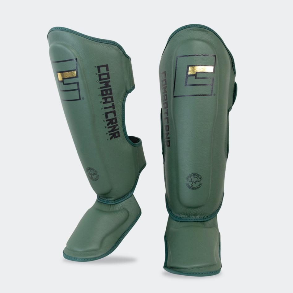 Limited Release Monochrome Series HMIT shin guards in Striking OD Green cowhide leather. Professional grade Muay Thai shin guards expert craftsmanship from Bangkok, Thailand. The sleek contoured form fitting design with shock absorbing dual layer padding offers amazing protection and unimpeded movement.